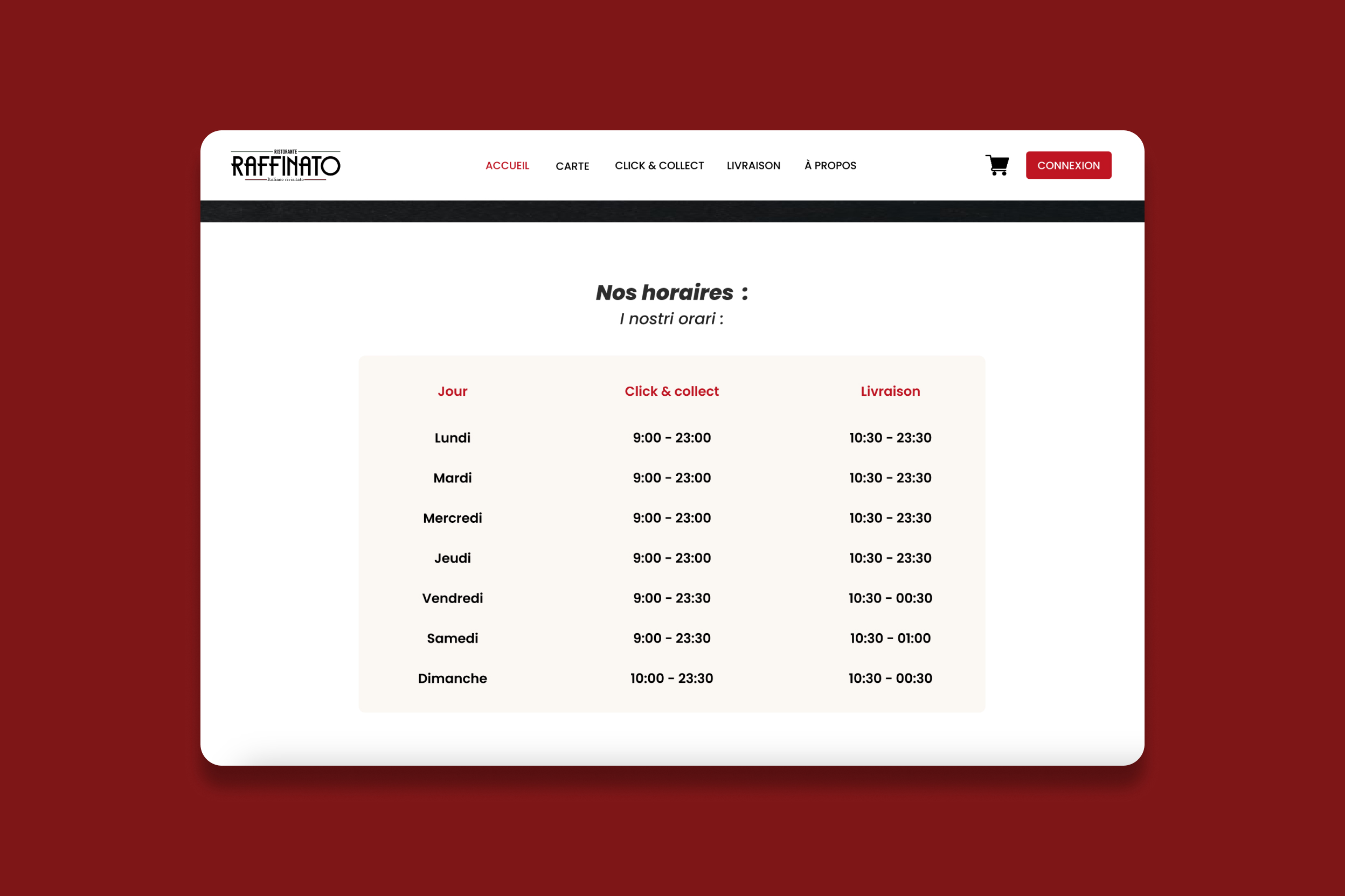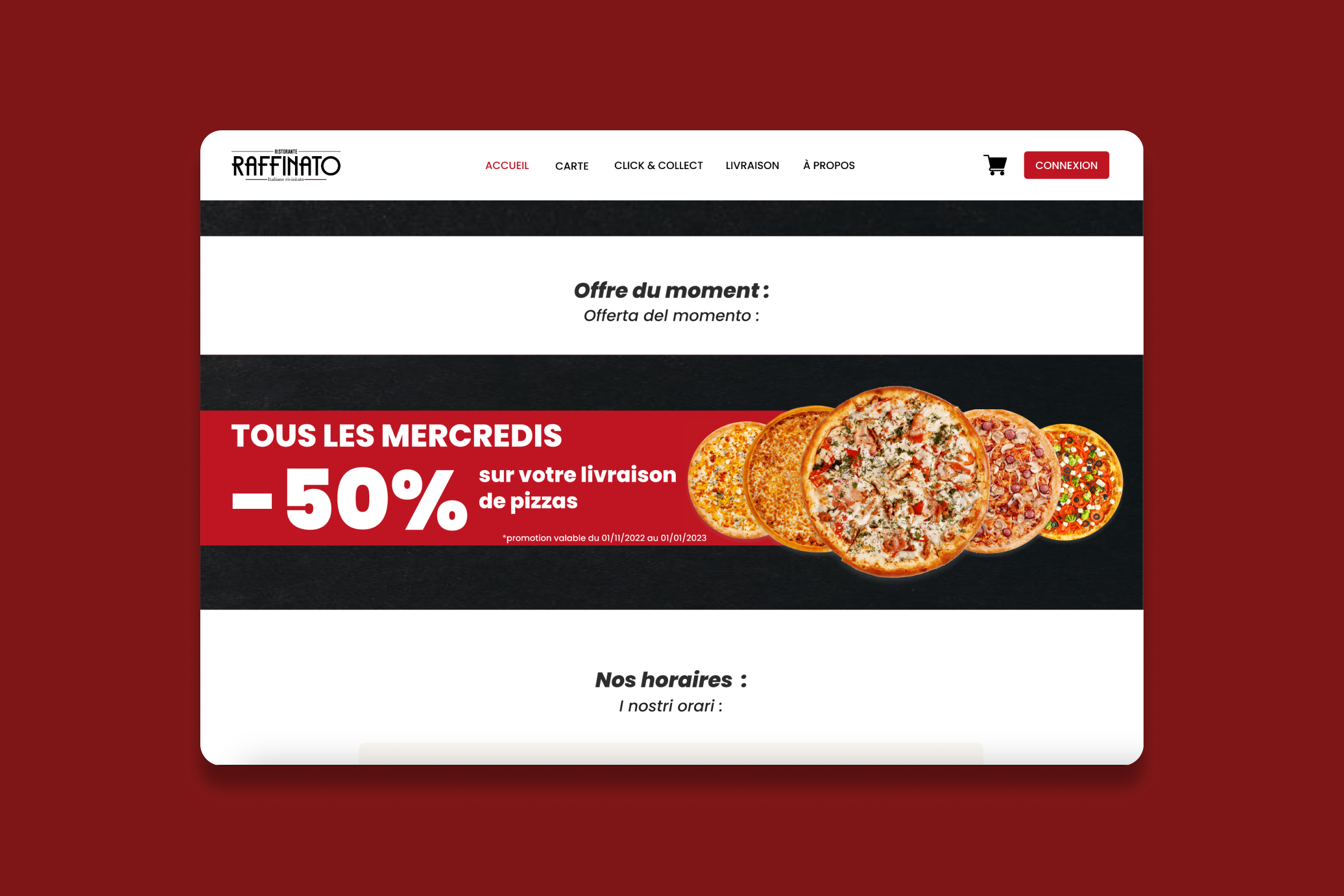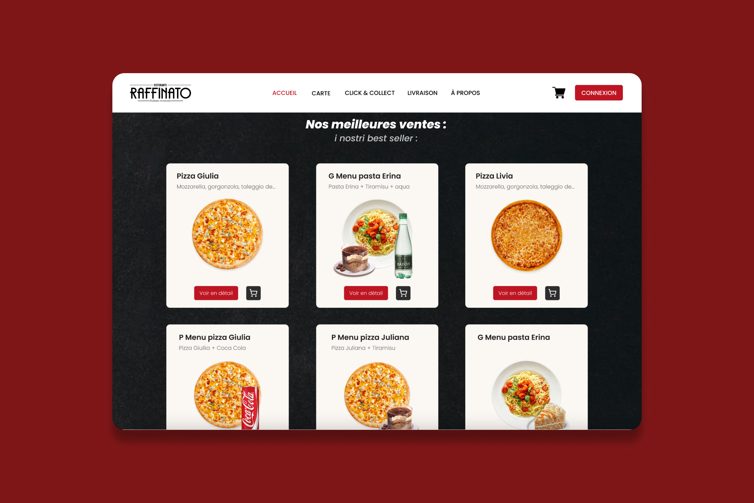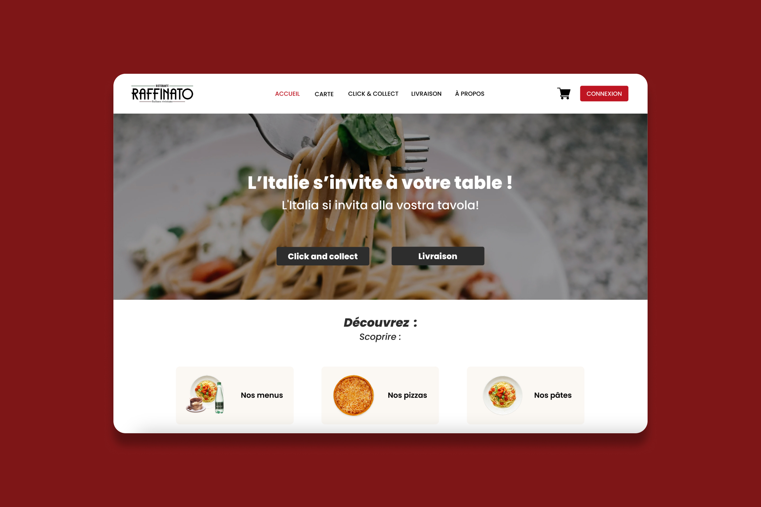 Dans ce projet, j'ai développé un site web sur WordPress pour un restaurant italien fictif nommé Raffinato. Initialement, j'ai conçu une maquette graphique (UI/UX) sur Figma, répondant à la contrainte de l'ajout de la livraison et du click and collect. Ensuite, j'ai transformé cette maquette en un site web fonctionnel en utilisant WordPress, intégrant des fonctionnalités permettant aux clients de commander facilement leurs repas en ligne, en choisissant entre la livraison à domicile ou le retrait en magasin. Mon objectif était de proposer une expérience utilisateur fluide et intuitive, tout en répondant aux besoins spécifiques du restaurant fictif et en assurant une gestion facile des commandes via l'interface d'administration WordPress.